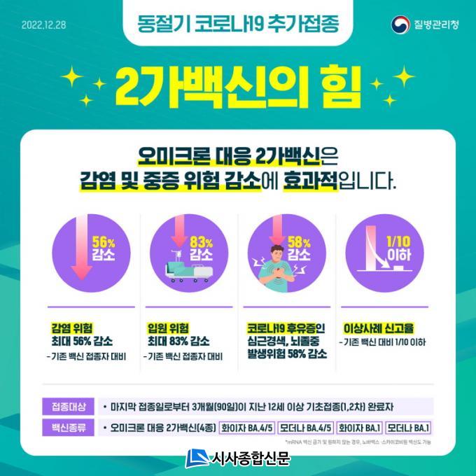 µ¿Àý±â 2°¡¹é½Å Ãß°¡Á¢Á¾Àº ¿À¹ÌÅ©·Ð º¯ÀÌ ´ëÀÀ 2°¡¹é½Å 4Á¾(¸ð´õ³ª BA.1 ±â¹Ý, ÈÀÌÀÚ BA.1 ±â¹Ý, ¸ð´õ³ª BA.4/5, ÈÀÌÀÚ BA.4/5 ±â¹Ý)ÀÌ È°¿ëµÇ¸ç, 12¼¼ ÀÌ»ó ½Ã¹Î Áß ±âÃÊÁ¢Á¾(1¡¤2Â÷)À» ¿Ï·áÇÑ »ç¶÷Àº ´©±¸³ª Á¢Á¾ °¡´ÉÇÏ´Ù.