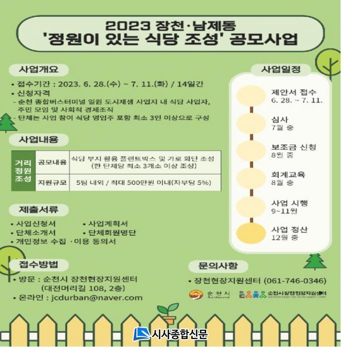 [½Ã»çÁ¾ÇսŹ® = Àå¹Î±Ô ±âÀÚ] ¼øÃµ½Ã(½ÃÀå ³ë°ü±Ô)´Â Á¾ÇÕ¹ö½ºÅ͹̳ΠÀÏ¿ø µµ½ÃÀç»ý Ȱ¼ºÈ »ç¾÷±¸¿ªÀ» ´ë»óÀ¸·Î 2023 Àåõ¡¤³²Á¦µ¿ Á¤¿øÀÌ ÀÖ´Â ½Ä´ç Á¶¼º °ø¸ð»ç¾÷ ½ÅûÀÚ¸¦ ¿À´Â 11ÀϱîÁö ¸ðÁýÇÑ´Ù.