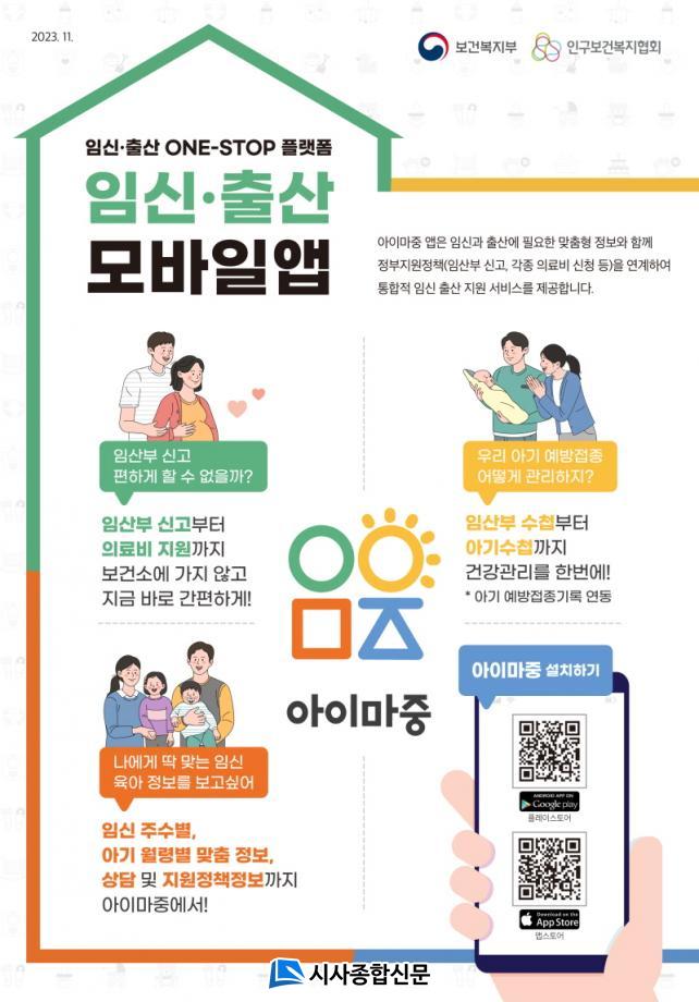 ÈÞ´ëÆù(Ç÷¹À̽ºÅä¾î, ¾Û½ºÅä¾î)¿¡ ¼³Ä¡ÇÑ ¡®¾ÆÀ̸¶Áß¡¯ ¾Û¿¡¼´Â ÀÓ»êºÎ ½Å°í(¿ì¿ïÁõ ÀÚ°¡°Ë»çµµ °¡´É)¸¦ ºñ·ÔÇØ ÀÇ·áºñ Áö¿ø°ú ÀÓ»êºÎ ¼öø(Á¤±âÁøÂû.ÀӽŠÁß °Ë»ç.¾Æ±â¿¡°Ô ÇÒ ¸», ¾ö¸¶.ÅÂ¾Æ º¯È º¸±â), ¾Æ±â ¼öø(¼ºÀå±â·Ï.ÀÇ·á±â°ü ¹æ¹®.°Ç°°ËÁø, ¾Æ±â º¯È º¸±â.¾Æ±â ¿¹¹æÁ¢Á¾ Á¶È¸). ±×¸®°í ´Ù¾çÇÑ Áö¿øÁ¤Ã¥Á¤º¸(Ãâ»êÀå·Á±Ý µî ÀӽŰú Ãâ»ê¿¡ ÇÊ¿äÇÑ Á¤º¸)¸¦ ¾òÀ» ¼ö ÀÖ´Ù.