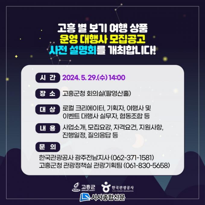 | °íÈﱺ, º° º¸±â ¿©Çà(°¡Äª) »óǰ¿î¿µ´ëÇà»ç ¸ðÁý »çÀü¼³¸íȸ °³ÃÖ ¿À´Â 5¿ù 29ÀÏ ¿ÀÈÄ 2½Ã °íÈﱺû ÆÈ¿µ»êȦ¿¡¼ °³ÃÖ