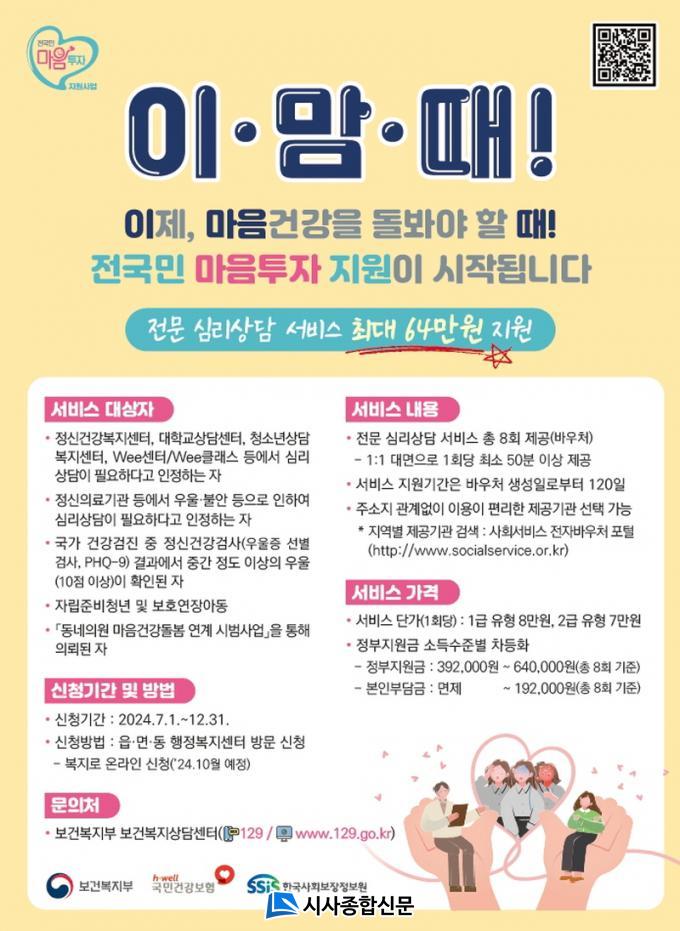 ÀÌ »ç¾÷Àº ¿ì¿ï¡¤ºÒ¾È µî Á¤¼Àû ¾î·Á¿òÀÌ ÀÖ´Â ±¹¹Î¿¡°Ô Àü¹®ÀûÀÎ ½É¸®»ó´ã ¼ºñ½º¸¦ Á¦°øÇÏ´Â »ç¾÷À¸·Î Èñ¸ÁÀÚ¿¡°Ô ÃÖ¼Ò 50ºÐ ÀÌ»ó 1:1 ´ë¸é ½É¸®»ó´ã ¼ºñ½º¸¦ ÃÑ 8ȸ ¹ÞÀ» ¼ö ÀÖ´Â ¹Ù¿ìó¸¦ Á¦°øÇÑ´Ù.