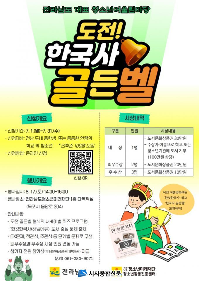 Àü³²µµ°¡ ÁÖÃÖÇϰí Àü³²µµÃ»¼Ò³â¹Ì·¡Àç´ÜÀÌ ÁÖ°üÇÏ´Â ¡®2024³â Àü¶ó³²µµ ´ëÇ¥ û¼Ò³â ¾î¿ï¸²¸¶´ç¡¯ÀÇ ÀÏȯÀ¸·Î ¿î¿µµÇ´Â ¡®µµÀü! Çѱ¹»ç °ñµçº§¡¯Àº Àü³²µµ³» ÁßÇлý ¶Ç´Â µ¿µîÇÑ ¿¬·ÉÀÇ Çб³ ¹Û û¼Ò³âÀ» ´ë»óÀ¸·Î 100¸íÀÇ Âü°¡ÀÚ¸¦ ¸ðÁýÇÑ´Ù.
