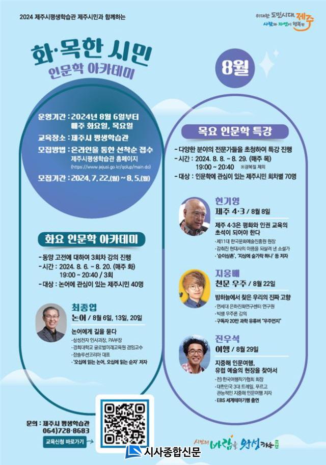 ¸ñ¿ä Àι®ÇÐ ¾ÆÄ«µ¥¹Ì´Â 8¿ù 8ÀϺÎÅÍ 29ÀϱîÁö ¸ÅÁÖ ¸ñ¿äÀÏ ¿ÀÈÄ 7½Ã¿¡ ÁøÇàµÉ ¿¹Á¤À¸·Î, 8¿ù 8ÀÏ¿¡´Â ¼Ò¼³¡®¼øÀÌ»ïÃÌ¡¯ÀÇ ÀúÀÚÀÎ Çö±â¿µ ÀÛ°¡ÀÇ¡®4.3¡¯ÁÖÁ¦ °¿¬, À̾î 22ÀÏ¿¡´Â 20¸¸ °úÇÐ À¯Æ©¹öÀÎ Áö¿õ¹è °»çÀÇ Ãµ¹®ÇÐ °¿¬À», 29ÀÏ¿¡´Â Áø¿ì¼® °»çÀÇ ÁöÁßÇØ Àι® ¿©Çà¿¡ °üÇÑ °ÀǸ¦ ÁøÇàÇÑ´Ù.