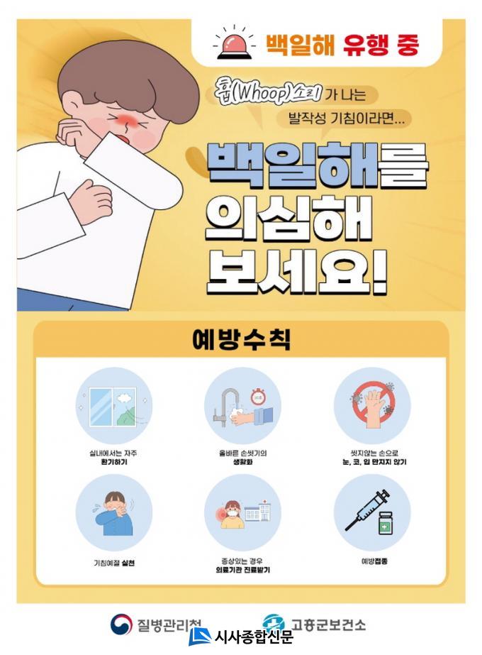 ¹éÀÏÇØ´Â 2±Þ °¨¿°º´À¸·Î °¡º¿î ±âħ, °¡·¡, Ä๰·Î ½ÃÀÛÇØ ¼ûÀ» µéÀ̽¯ ¶§ Äg(whoop) ¼Ò¸®°¡ ³ª´Â Ư¡ÀÌ ÀÖÀ¸¸ç, ¿¹¹æ¼öÄ¢À¸·Î´Â ¿¹¹æÁ¢Á¾(ÃÑ 6ȸ) ¹Þ±â, È帣´Â ¹°¿¡ 30ÃÊ ÀÌ»ó ¼Õ ¾Ä±â, ±âħÇÒ ¶§ ÈÞÁö³ª ¿Ê¼Ò¸Å·Î ÀÔ°ú ÄÚ °¡¸®±â, ¾ÄÁö ¾ÊÀº ¼ÕÀ¸·Î ´«¡¤ÄÚ¡¤ÀÔ ¸¸ÁöÁö ¾Ê±â, ±âħ Áõ»óÀÌ ÀÖÀ¸¸é ÀÇ·á±â°ü Áø·á¹Þ±â µîÀÌ ÀÖ´Ù.