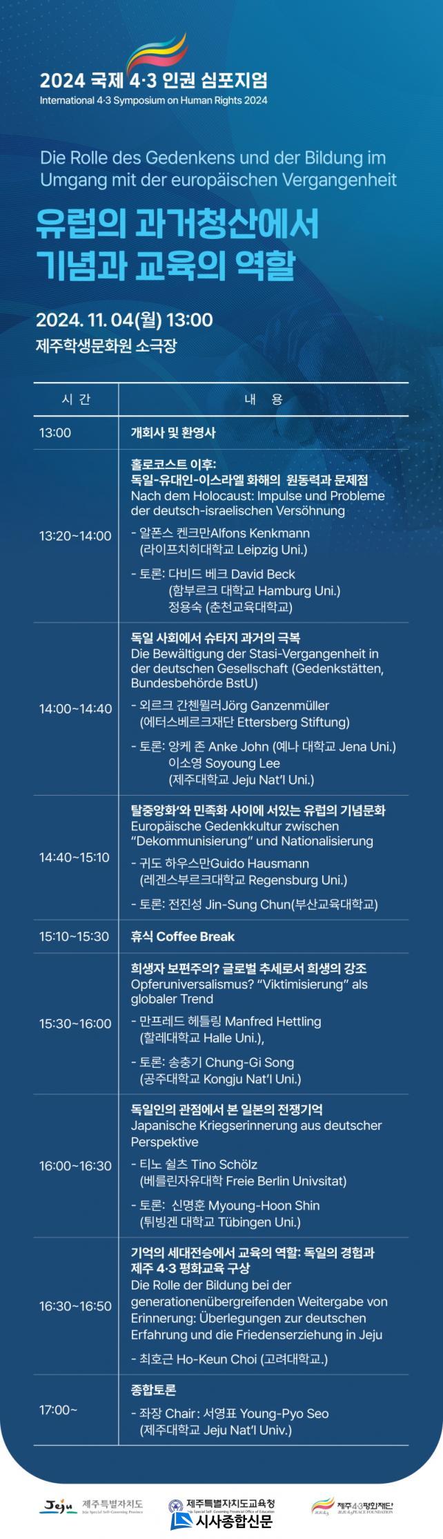Á¦ÁÖÆ¯º°ÀÚÄ¡µµ(µµÁö»ç ¿À¿µÈÆ)¿Í Á¦ÁÖÆ¯º°ÀÚÄ¡µµ±³À°Ã»(±³À°°¨ ±è±¤¼ö)ÀÌ ÁÖÃÖÇϰí Á¦ÁÖ4․3ÆòÈÀç´ÜÀÌ ÁÖ°üÇÏ´Â À̹ø Çà»ç´Â Á¦2Â÷ ¼¼°è´ëÀüÀÌ ³¡³ ÈÄ µ¶ÀÏÀÇ °ú°Å»ç ±³À°°ú ±â³ä ¹®È¿¡ ´ëÇÏ¿© µ¶ÀÏÀ» ´ëÇ¥ÇÏ´Â °ú°Å»ç ¿¬±¸ ¹× ±³À°±â°üÀÎ ¿¡Åͽºº£¸£Å©Àç´Ü°ú ¶óÀÌÇÁ´ÏÄ¡, ÇԺθ£Å©, º£¸¦¸°ÀÚÀ¯´ë µî ÁÖ¿ä ´ëÇÐ ¿¬±¸ÀÚµéÀÌ Âü¿©ÇÑ´Ù.