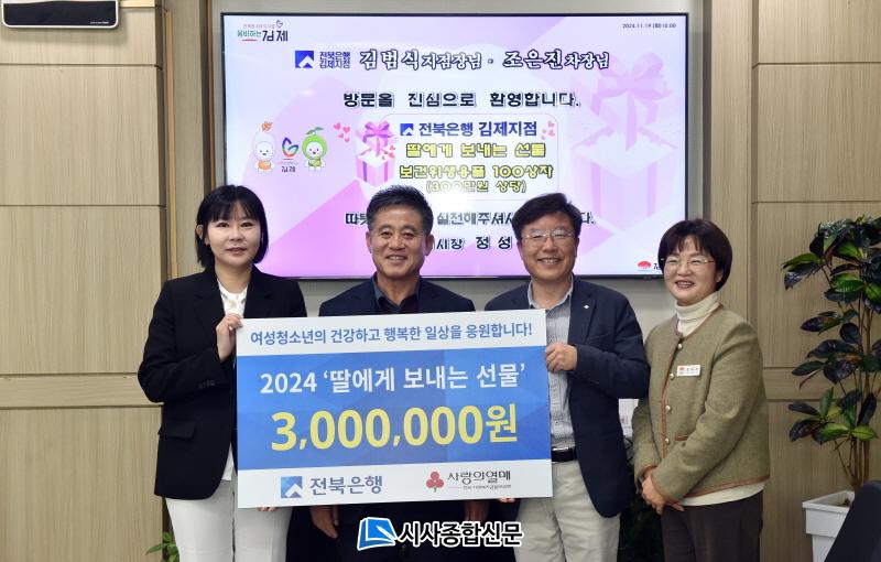 [½Ã»çÁ¾ÇսŹ® = ¿À½ÂÅà ±âÀÚ] ±èÁ¦½Ã(½ÃÀå Á¤¼ºÁÖ)´Â 19ÀÏ ÀüºÏÀºÇà ±èÁ¦ÁöÁ¡(ÁöÁ¡Àå ±è¹ü½Ä)ÀÌ °æÁ¦Àû ¾î·Á¿òÀ¸·Î º¸°ÇÀ§»ý¿ëǰ ±¸ÀÔ¿¡ ºÎ´ãÀ» ´À³¢´Â ¿©¼ºÃ»¼Ò³âÀ» À§ÇØ 300¸¸ ¿ø »ó´çÀÇ º¸°ÇÀ§»ý¿ëǰ 100»óÀÚ¸¦ ±âŹÇß´Ù°í ¹àÇû´Ù.