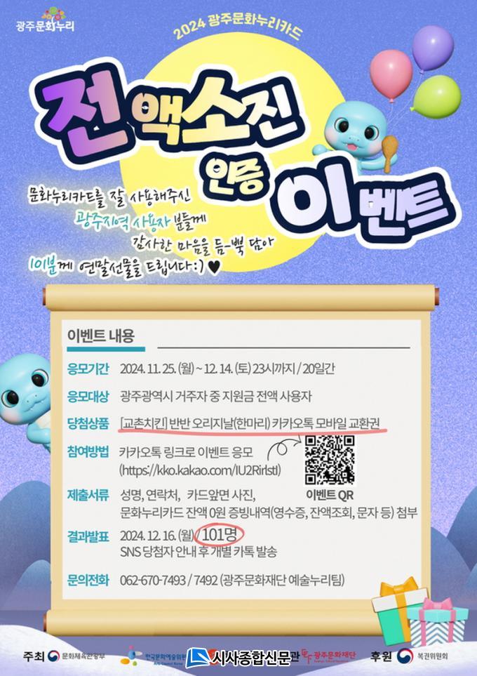 ´ç÷ÀÚ´Â 12¿ù 16ÀÏ ¡®±¤ÁÖ¹®È´©¸®¡¯ °ø½Ä ºí·Î±×¿Í ÀνºÅ¸±×·¥¡¤Ä«Ä«¿ÀÅå ä³Î(±¤ÁÖ¹®È´©¸®Ä«µå) µî »çȸ°ü°è¸Á¼ºñ½º(SNS)¿¡ °øÁöÈÄ ÀÀ¸ðÀÚ Ä«Ä«¿ÀÅå °èÁ¤À¸·Î ±âÇÁƼÄÜÀ» ¹ß¼ÛÇÒ ¿¹Á¤ÀÌ´Ù. ÀÚ¼¼ÇÑ »çÇ×Àº ±¤ÁÖ¹®ÈÀç´Ü ¿¹¼ú´©¸®ÆÀ(062-670-7492/7493)À¸·Î ¹®ÀÇÇÏ¸é µÈ´Ù.
