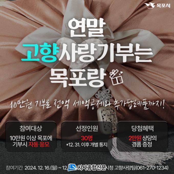 ¡¸2024³â ¿¬¸» °íÇâ»ç¶û±âºÎ´Â ¸ñÆ÷¶û¡¹À̺¥Æ®´Â 16ÀϺÎÅÍ 12¿ù 30ÀϱîÁö ÁøÇàµÇ¸ç, ÇØ´ç ±â°£ Áß ¸ñÆ÷½Ã¿¡ 10¸¸¿ø ÀÌ»ó ±âºÎÇÑ °æ¿ì º°µµÀÇ ½Åû ¾øÀÌ ÀÚµ¿À¸·Î À̺¥Æ®¿¡ ÀÀ¸ðµÈ´Ù.