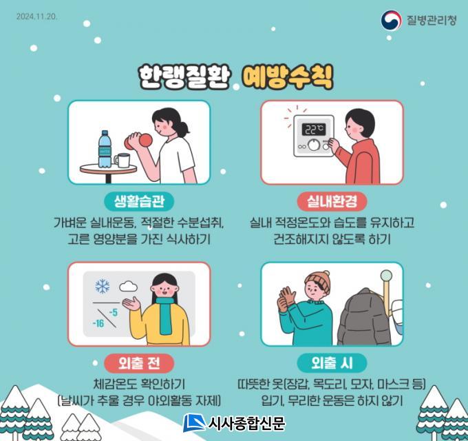 ÇÑ·©Áúȯ ¿¹¹æÀ» À§Çؼ´Â ÃßÀ§¿¡ °©Àڱ⠳ëÃâµÇÁö ¾Ê°Ô ÁÖÀÇÇÏ°í ¹«¸®ÇÑ ½ÅüȰµ¿À» ÇÇÇØ¾ß ÇÑ´Ù. µ¿»ó¿¡ °É¸®¸é ºñºñÁö ¸»°í µû¶æÇÑ ¹°¿¡ 30ºÐ °¡·® ´ã°¡ ü¿ÂÀ» À¯ÁöÇϰí Áï½Ã º´¿øÀ¸·Î °¡¾ß ÇÑ´Ù. 65¼¼ ÀÌ»ó ³ë³âÃþÀÌ Àüü ȯÀÚÀÇ 51.5%¸¦ Â÷ÁöÇÏ´Â ¸¸Å °Ü¿ïö ¾î¸£½ÅÀÇ °Ç°°ü¸®¿¡ ¼¼½ÉÇÑ º¸»ìÇËÀÌ ÇÊ¿äÇÏ´Ù.