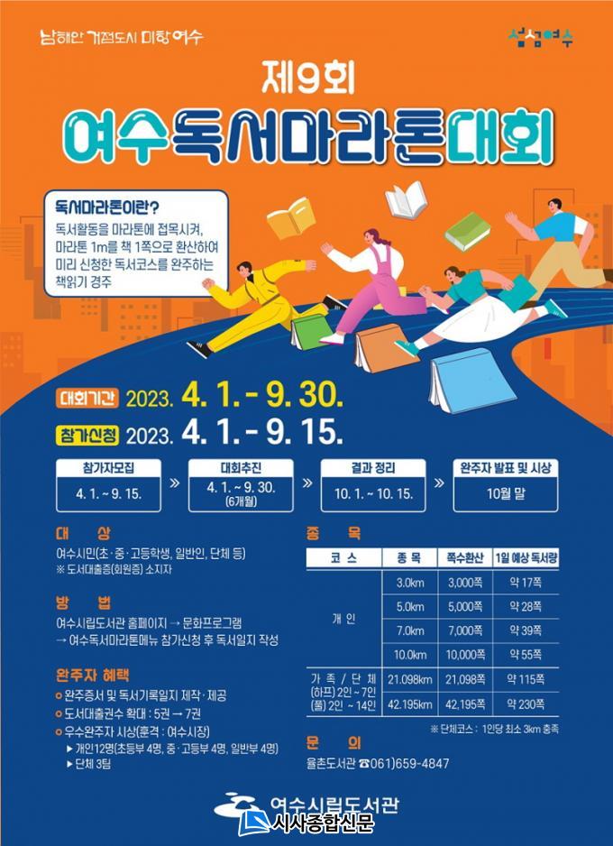 ½ÅûÀº 4¿ù 1ÀϺÎÅÍ 9¿ù 15ÀϱîÁö ¿©¼öµ¶¼¸¶¶óÅæ´ëȸ ȨÆäÀÌÁö(yslib.yeosu.go.kr/marathon/lib/)¿¡¼ ÇÒ ¼ö ÀÖÀ¸¸ç, Âü°¡ ½Åû ÈÄ µ¿ÀÏ È¨ÆäÀÌÁö¿¡¼ µ¶¼±â·ÏÀÏÁö¸¦ ÀÛ¼ºÇÏ¸é µÈ´Ù.¿ÏÁÖÀÚ¿¡°Ô´Â ¿ÏÁÖÁõ¼ ¼ö¿©, µ¶¼±â·ÏÀÏÁö Áö±Þ, µµ¼ ´ëÃâ±Ç¼ö È®´ë(5±Ç¡æ7±Ç) µî ´Ù¾çÇÑ ÇýÅÃÀÌ ºÎ¿©µÈ´Ù.