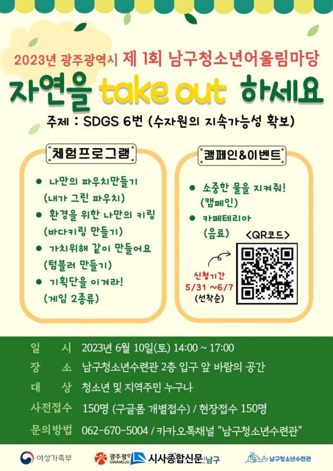[½Ã»çÁ¾ÇսŹ® = ¿À½ÂÅà ±âÀÚ] ±¤ÁÖ³²±¸Ã»¼Ò³â¼ö·Ã°üÀº 5¿ù31ÀϺÎÅÍ 6¿ù 7ÀϱîÁö û¼Ò³â ¹× Áö¿ªÁֹΠ´ë»óÀ¸·Î 6¿ù 10ÀÏ ÁøÇàÇÏ´Â ³²±¸Ã»¼Ò³â¾î¿ï¸²¸¶´ç ¡®ÀÚ¿¬À» take out Çϼ¼¿ä¡¯ Âü°¡ÀÚ¸¦ ¸ðÁýÇÑ´Ù°í ¹àÇû´Ù.