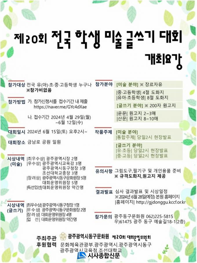 Á¦20ȸ Àü±¹ Çлý ¹Ì¼ú¡¤±Û¾²±â ´ëȸ Âü°¡¸¦ ¿øÇÏ´Â ÇлýÀº 12ÀϱîÁö Âü°¡½Åû¼¸¦ ÀÛ¼ºÇÏ¿© (https://naver.me/GYc4dXae) ·Î Á¦ÃâÇÏ¸é µÈ´Ù.