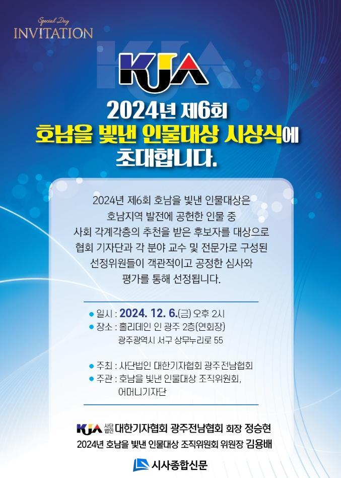 ÇÑÆí, »ç´Ü¹ýÀÎ ´ëÇѱâÀÚÇùȸ ±¤ÁÖ¡¤Àü³²Çùȸ°¡ ÁÖÃÖÇϰí 2024³â Á¦6ȸ È£³²À» ºû³½ Àι°´ë»ó Á¶Á÷À§¿øÈ¸¿Í ¾î¸Ó´Ï±âÀÚ´ÜÀÌ ÁÖ°üÇÑ ¡®2024³â Á¦6ȸ È£³²À» ºû³½ Àι°´ë»ó¡¯ ½Ã»ó½ÄÀº ¿À´Â 12¿ù 06ÀÏ(±Ý) ¿ÀÈÄ 2½Ã ±¤Áֽà ¼±¸ Ä¡Æòµ¿¿¡ À§Ä¡ÇÑ È¦¸®µ¥ÀÌ ÀÎ ±¤ÁÖÈ£ÅÚ 2Ãþ ¿¬È¸Àå¿¡¼ °³ÃֵȴÙ.