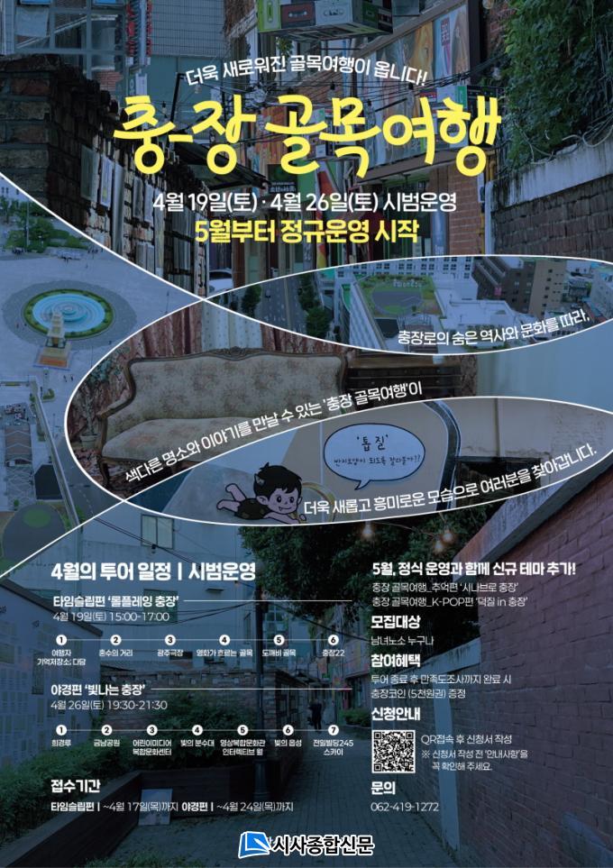 ¿À·£ ¼¼¿ù ±¤ÁÖÀÇ Á߽ɰ¡·Î¼ ±¤Áֽùΰú ÇÔ²²ÇØ ¿Â ¡¯ÃæÀå·Î¡®´Â ´ëµµ½ÃÀÇ È·ÁÇÔ°ú °ñ¸ñÀÇ ¼Ò¹ÚÇÑ Á¤Ãë°¡ °øÁ¸ÇÏ´Â ¸Å·Â ³ÑÄ¡´Â Àå¼Ò´Ù. °ñ¸ñ ¿©ÇàÀº ÃæÀå·ÎÀÇ ÀÌ·¯ÇÑ Æ¯»öÀ» »ì·Á ÃæÀå·ÎÀÇ ³·°ú ¹ãÀ» ¾Æ¿ì¸£´Â Ưº°ÇÑ °æÇèÀ» ¼±»çÇϰíÀÚ ¸¶·ÃµÆ´Ù.