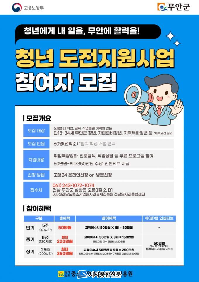 ¸ðÁýÀº ¿¹»ê ¼ÒÁø ½Ã±îÁö »ó½Ã ÁøÇàµÇ¸ç, ½ÅûÀº °í¿ë24 ´©¸®Áý(www.work24.go.kr)À» ÀÌ¿ëÇϰųª Àü³²ÀÏÀÚ¸®Á¾ÇÕ¼¾ÅÍ(¹«¾È±º »ïÇâÀ¾ ¿À·æ3±æ 2)¸¦ ¹æ¹®ÇÏ¸é µÈ´Ù.