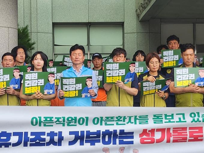 [½Ã»çÁ¾ÇսŹ® = ¿À½ÂÅà ±âÀÚ] º¸°ÇÀÇ·á³ëÁ¶ ¼º°¡·Ñ·Îº´¿øÁöºÎ´Â Áö³ 17ÀÏ º´¿ø º»°ü ¾Õ¿¡¼ ±âÀÚȸ°ßÀ» ¿°í ºÒ±ÔÄ¢ÇÑ 3±³´ë ±Ù¹« Ư¼ºÀ¸·Î °ü·Ã Áúº´ ¹ß»ý ºñÀ²ÀÌ ³ôÀº »ç¾÷Àå¿¡¼ Á÷¿ø °Ç°±ÇÀº ȯÀÚ ¾ÈÀü°ú Á÷°áµÈ´Ù¸ç º´°¡ º¸Àå µîÀ» Ã˱¸Çϸç Á÷¿ø °Ç°±Ç È®º¸ ÅõÀï¿¡ ³ª¼¹´Ù.