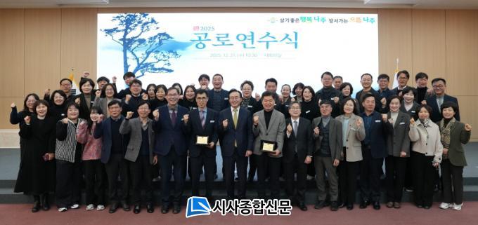 Çà»ç¿¡´Â À±º´Å ³ªÁÖ½ÃÀåÀ» ºñ·ÔÇÑ °£ºÎ °ø¹«¿ø°ú Á÷¿ø µî 150¿© ¸íÀÌ Âü¼®ÇÑ °¡¿îµ¥ 1ºÎ Á¾¹«½Ä°ú 2ºÎ °ø·Î¿¬¼ö½Ä ¼øÀ¸·Î ÁøÇàµÆ´Ù. 1ºÎ Á¾¹«½Ä¿¡¼´Â 2025³â ÇÑ ÇØ µ¿¾È ½ÃÁ¤ ¹ßÀü°ú ½Ã¹Î º¹Áö ÁõÁø¿¡ ±â¿©ÇÑ ½Ã¹Î°ú ±â°ü, °ø¹«¿ø µî 20¸í¿¡°Ô Á¤ºÎ¿Í Àü¶ó³²µµ, ³ªÁֽà ǥâÀÌ ¼ö¿©µÆ´Ù.