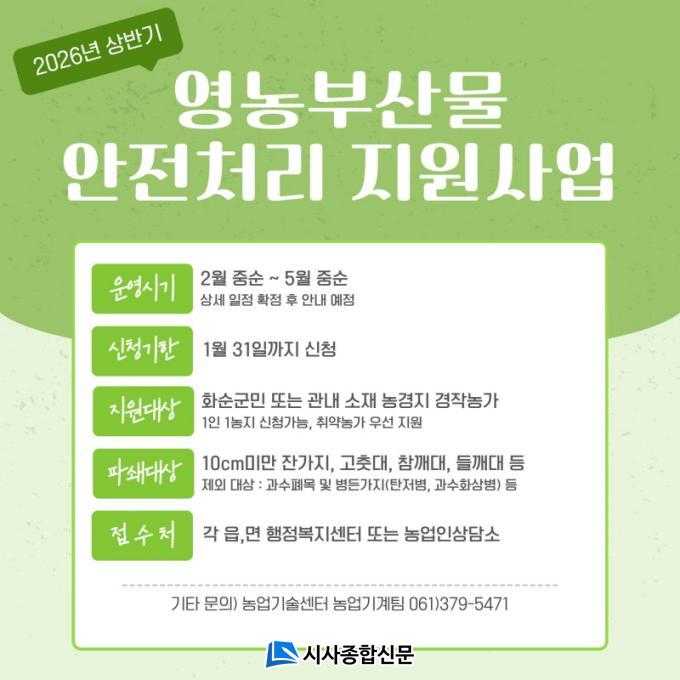 ȼø±ºÀº ¿µ³óºÎ»ê¹° ¾ÈÀüó¸® Áö¿ø´ÜÀ» »ó¹Ý±â(2¿ù~5¿ù)¿Í ÇϹݱâ(11¿ù~12¿ù)·Î ³ª´©¾î ¿î¿µÇÒ °èȹÀÌ´Ù. À̸¦ ÅëÇØ ³ó¾÷Àε鿡°Ô 1ÀÎ 1³óÁö¸¦ ±âÁØÀ¸·Î Àܰ¡Áö, °íÃå´ë µî ³ó¾÷ºÎ»ê¹° ÆÄ¼â ÀÛ¾÷À» Áö¿øÇϸç, °í·É³ó¾÷Àΰú Ãë¾à°èÃþÀ» ¿ì¼±À¸·Î ¹«»ó Áö¿øÇÒ ¿¹Á¤ÀÌ´Ù.