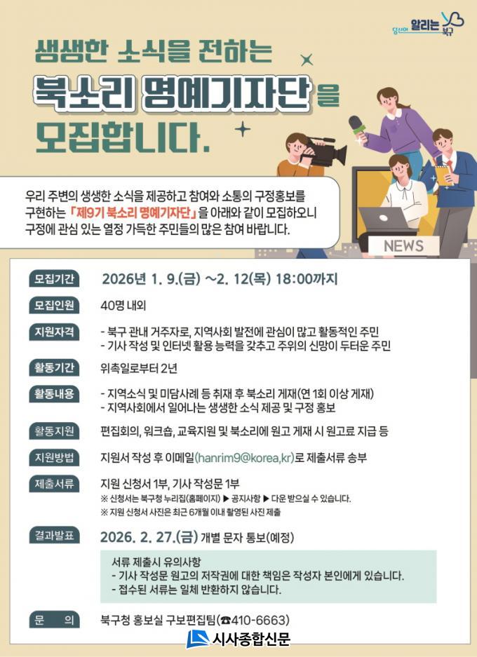 À̹ø ¸ðÁý¿¡¼´Â Á¦9±â ¸í¿¹±âÀÚ´Ü 40¿© ¸íÀ» ¼±¹ßÇÒ °èȹÀÌ´Ù. Áö¿ª»çȸ¿¡ °ü½ÉÀÌ ¸¹°í ±â»ç ÀÛ¼º ¹× ÀÎÅÍ³Ý È°¿ë ´É·ÂÀ» °®Ãá ºÏ±¸ ÁÖ¹ÎÀ̶ó¸é ´©±¸³ª ½ÅûÇÒ ¼ö ÀÖ´Ù.