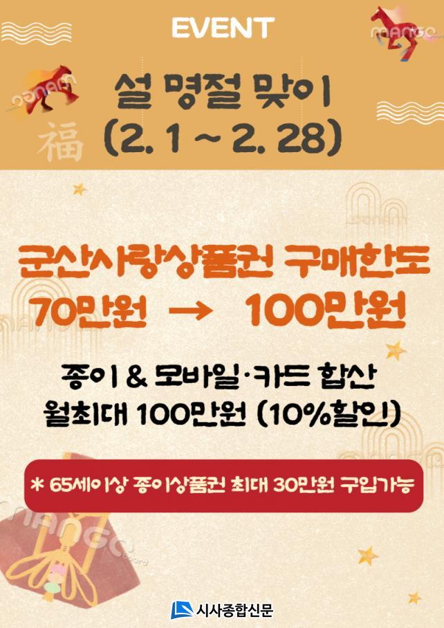 [½Ã»çÁ¾ÇսŹ® = ¿À½ÂÅà ±âÀÚ] ±º»ê½Ã°¡ ¼³ ¸íÀýÀ» ¸Â¾Æ 2¿ù ÇÑ ´Þ°£ ±º»ê»ç¶û»óǰ±ÇÀÇ 1ÀÎ´ç ¿ù ±¸¸Å Çѵµ¸¦ ±âÁ¸ 70¸¸ ¿ø¿¡¼ 100¸¸ ¿øÀ¸·Î ÇѽÃÀûÀ¸·Î Àü°Ý »óÇâÇÑ´Ù°í 26ÀÏ ¹àÇû´Ù.