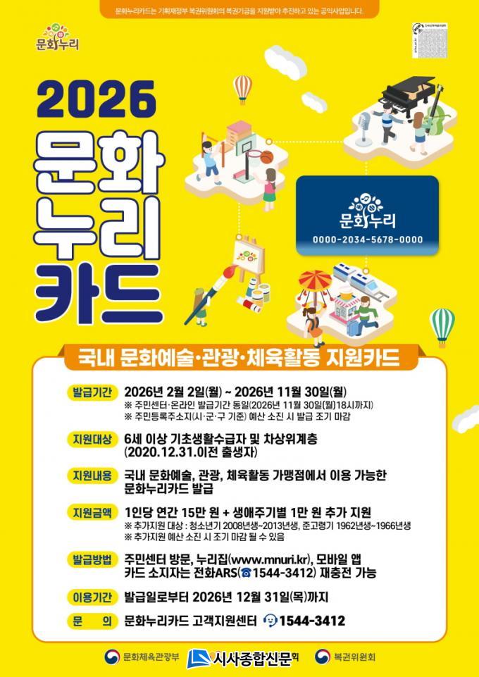 ¹®È´©¸®Ä«µå´Â ¹®È¿¹¼ú¡¤±¹³»¿©ÇࡤüÀ°È°µ¿ ÀÌ¿ëÀ» Áö¿øÇÏ´Â Á¦µµ·Î, 2026³â¿¡´Â Áö³ÇØ ´ëºñ 1¸¸ ¿ø ÀλóµÈ ¿¬°£ 15¸¸ ¿øÀÌ Áö¿øµÈ´Ù. ƯÈ÷ û¼Ò³â±â(13~18¼¼)¿Í Áذí·É±â(60~64¼¼) ´ë»óÀÚ´Â 1¸¸ ¿øÀÌ Ãß°¡ Áö¿øµÅ ÃÖ´ë 16¸¸ ¿ø±îÁö ÀÌ¿ëÇÒ ¼ö ÀÖ´Ù.