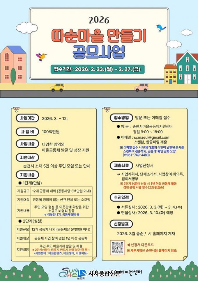 ¸ðÁý ±â°£Àº ¿À´Â 23ÀϺÎÅÍ 27ÀϱîÁöÀ̸ç, Á¢¼ö´Â ¹æ¹® ¶Ç´Â À̸ÞÀÏ·Î °¡´ÉÇÏ´Ù. ¹æ¹® Á¢¼ö´Â ¼øÃµ½Ã¸¶À»°øµ¿Ã¼Áö¿ø¼¾ÅÍ(ÆòÀÏ 09:00~18:00)¿¡¼ ÁøÇàÇϸç, À̸ÞÀÏ Á¢¼ö´Â scmaeul@gmail.comÀ¸·Î ½Åû¼ ½ºÄµº»°ú ÇÑ±ÛÆÄÀÏÀ» ÇÔ²² Á¦ÃâÇÏ¸é µÈ´Ù.