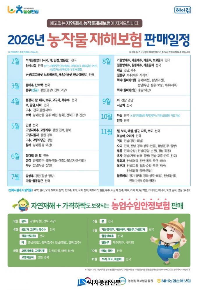 °¡ÀÔ ´ë»óÀÚ´Â º¸Çè ´ë»ó ³óÀÛ¹°À» °æÀÛÇÏ°í ³ó¾÷°æ¿µÃ¼¿¡ µî·ÏÀ» ÇÑ °³ÀÎ ¶Ç´Â ¹ýÀÎÀ¸·Î, °¡ÀÔ °¡´ÉÇÑ Ç°¸ñÀº ³óÀÛ¹° ÀçÇØº¸Çè 78°³ ǰ¸ñ°ú ³ó¾÷¼öÀÔ¾ÈÁ¤º¸Çè 20°³ ǰ¸ñÀ¸·Î º, ´ëÆÄ, °í±¸¸¶, ¿Á¼ö¼ö, Äá, ¾ç¹èÃß, °¨ÀÚ, Æ÷µµ, º¸¸® µîÀÌ ÀÖ´Ù. ǰ¸ñº°·Î °¡ÀÔ ±â°£ÀÌ ´Ù¸£¹Ç·Î °¡±î¿î Áö¿ª³óÇùÀ» ¹æ¹®ÇÏ¿© »ó´ã ÈÄ ½ÅûÇÏ¸é µÈ´Ù.