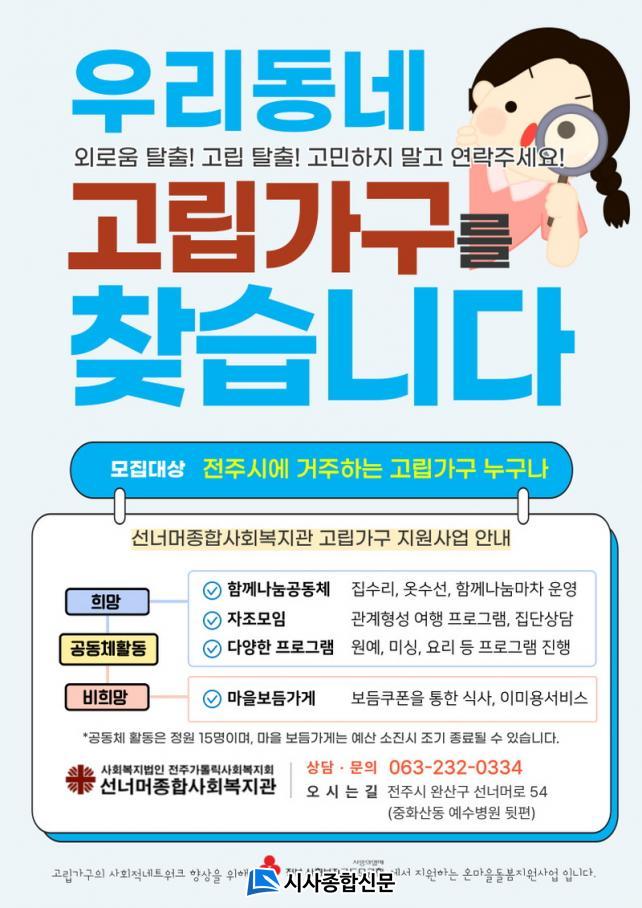 ¼±³Ê¸ÓÁ¾ÇÕ»çȸº¹Áö°üÀº °í¸³°¡±¸ Áö¿ø»ç¾÷ Âü¿©ÀÚ¸¦ »ó½Ã ¸ðÁýÇϰí ÀÖÀ¸¸ç, ¾ÕÀ¸·Îµµ µµ¿òÀÌ ÇÊ¿äÇÑ °í¸³ À§Çè °¡±¸¸¦ Áö¼ÓÀûÀ¸·Î ¹ß±¼ÇØ Áö¿ª»çȸ ±â¹Ý µ¹º½ ü°è¸¦ °ÈÇÒ °èȹÀÌ´Ù.