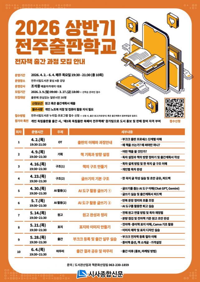 ÀüÁֽô ¿À´Â 9ÀϺÎÅÍ ÀüÁÖµµ¼°ü ´©¸®Áý(lib.jeonju.go.kr)À» ÅëÇØ ¡®2026 ÀüÁÖÃâÆÇÇб³¡¯ »ó¹Ý±â ÇÁ·Î±×·¥ Âü¿©ÀÚ¸¦ ¸ðÁýÇÑ´Ù°í 6ÀÏ ¹àÇû´Ù.