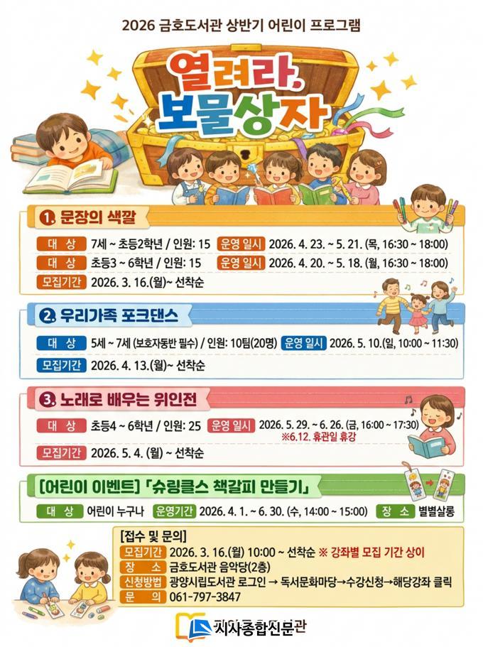 ÇÑÆí, 2026³â ±ÝÈ£µµ¼°ü »ó¹Ý±â ¾î¸°ÀÌ ÇÁ·Î±×·¥°ú °ü·ÃÇÑ ÀÚ¼¼ÇÑ »çÇ×Àº ±¤¾ç½Ã¸³µµ¼°ü ´©¸®Áý(http://lib.gwangyang.go.kr)¿¡¼ È®ÀÎÇϰųª ±ÝÈ£µµ¼°ü(¢Ï061-797-3847)À¸·Î ¹®ÀÇÇÏ¸é ¾È³»¹ÞÀ» ¼ö ÀÖ´Ù.