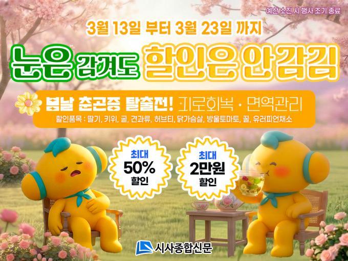 Çà»ç ±â°£ µ¿¾È °íÈï¸ô¿¡¼´Â Áö¿ª ³ó°¡¿Í ¾÷ü°¡ »ý»êÇÑ ´Ù¾çÇÑ °Ç°½ÄǰÀ» ÃÖ´ë 50% ÇÒÀÎµÈ °¡°ÝÀ¸·Î ÆÇ¸ÅÇÑ´Ù. ÁÖ¿ä »óǰÀ¸·Î´Â ¸é¿ª·Â °ü¸®¿¡ µµ¿òÀ» ÁÖ´Â µþ±â, ŰÀ§, À¯ÀÚ °¡°ø½Äǰ, °Ç° Â÷·ù¸¦ ºñ·ÔÇØ ÇǷΠȸº¹¿¡ ÁÁÀº ²Ü, ±â´É¼º ³ó»ê¹° ¹× °Ç° °¡°ø½Äǰ µîÀÌ ÁغñµÅ ÀÖ´Ù.