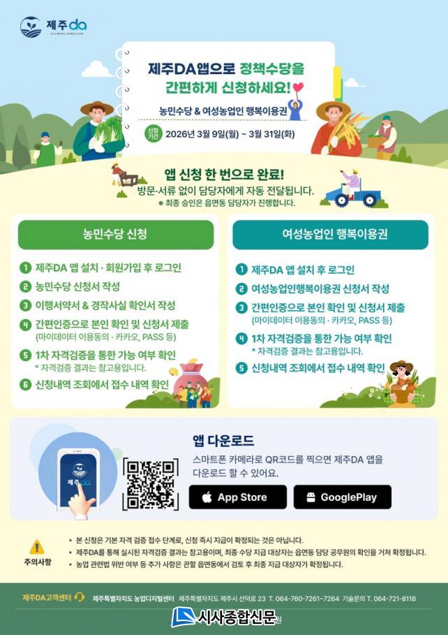 ³ó¹Î¼ö´ç ¹× ¿©¼º³ó¾÷ÀÎ ÇູÀÌ¿ë±Ç Áö¿ø»ç¾÷ ½Åû±â°£Àº 3¿ù 31ÀϱîÁöÀ̸ç, Á¦ÁÖDA ¾ÛÀ» ÅëÇÑ ºñ´ë¸é ½Åû ¼ºñ½º´Â 3¿ù 9ÀÏ ½Ã¹ü ¿î¿µÀ» ½ÃÀÛÇØ °ø°ø ¸¶À̵¥ÀÌÅÍ ¼ºñ½º ½ÂÀÎ ÀýÂ÷¸¦ °ÅÃÄ 3¿ù 16ÀϺÎÅÍ Á¤½Ä ¿î¿µÇÒ ¿¹Á¤ÀÌ´Ù.