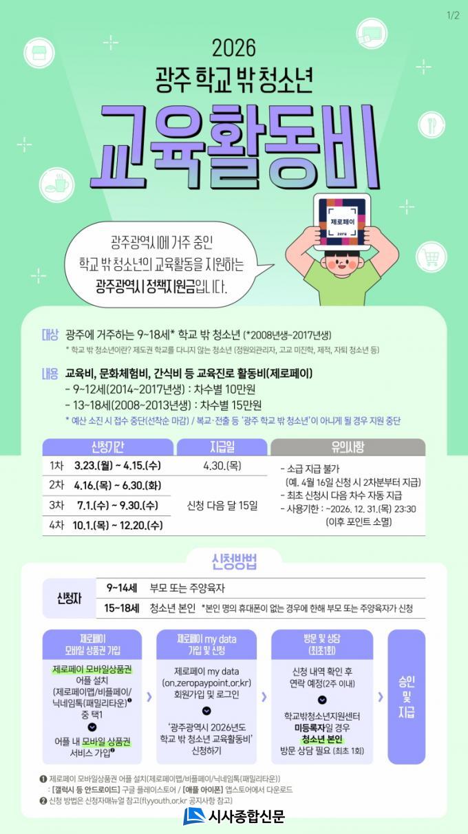 ±¤ÁÖ±¤¿ª½Ã(½ÃÀå °±âÁ¤)´Â Çб³ ¹Û û¼Ò³âÀÇ ±³À° ±âȸ¸¦ È®´ëÇÏ°í ¾ÈÁ¤ÀûÀÎ ¼ºÀåÀ» µÞ¹ÞħÇϱâ À§ÇØ ¡®Çб³ ¹Û û¼Ò³â ±³À°È°µ¿ºñ Áö¿ø»ç¾÷¡¯À» ¿î¿µÅ°·Î Çϰí, ¿À´Â 23ÀϺÎÅÍ ½ÅûÀ» ¹Þ´Â´Ù.