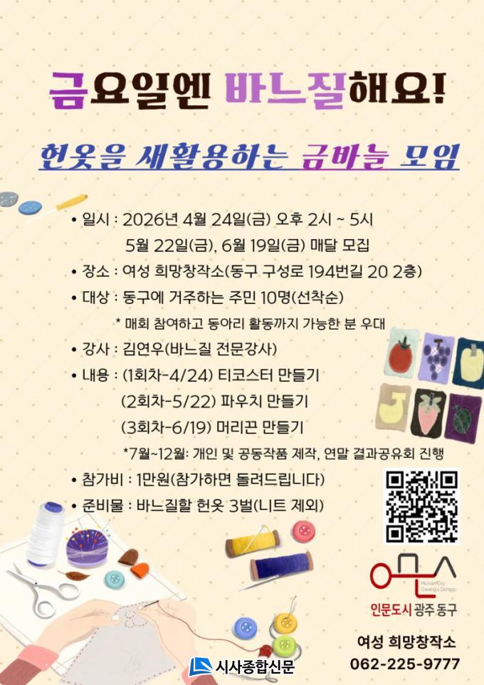 7¿ùºÎÅÍ 12¿ù±îÁö´Â ¸Åȸ ±Ý¿äÀÏ ¿ÀÈÄ 2½ÃºÎÅÍ 5½Ã±îÁö ¿©¼º Èñ¸ÁâÀÛ¼Ò(µ¿±¸ ±¸¼º·Î 194¹ø±æ 20, 2Ãþ)¿¡¼ °³ÀÎ ¹× °øµ¿À¸·Î ¹Ù´ÀÁú ÀÛǰÀ» Á¦ÀÛÇÒ ¿¹Á¤ÀÌ´Ù.