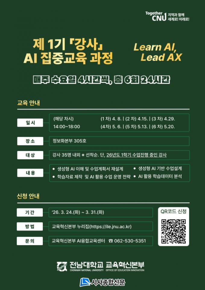 30ÀÏ Àü³²´ëÇб³¿¡ µû¸£¸é, ±³À°Çõ½Åº»ºÎ(º»ºÎÀå Á¤Àº°æ)´Â ¡®Á¦1±â °»ç AI ¿ª·® °È ÁýÁß±³À° °úÁ¤¡¯À» ¿î¿µÇÑ´Ù.
