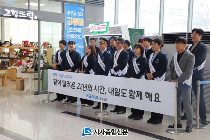 ¼øÃµ¿ª Çà»çÀå¿¡´Â °ø»ç ÀþÀº Á÷¿øµé·Î ±¸¼ºµÈ ÁִϾµå ¸â¹öµéÀÌ Á÷Á¢ ³ª¼ KTX 22ÁÖ³â ÃàÇÏ ¹× ÀÀ¿ø ¸Þ½ÃÁö º¸µå¸¦ ¿î¿µÇß´Ù. ¿Â÷ À̿밴µéÀº KTX¿¡ ¹Ù¶ó´Â Á¡°ú ÀÀ¿øÀÇ ±ÛÀ» Æ÷½ºÆ®ÀÕ¿¡ Àû¾î °øÀ¯ÇßÀ¸¸ç, Âü¿©ÇÑ °í°´µé¿¡°Ô´Â °¨»çÀÇ ¶±°ú ±â³äǰÀ» Àü´ÞÇϸç Ä£¹Ð°¨À» ´õÇß´Ù.