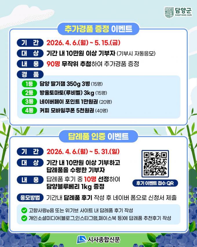 ÀÎÁõ À̺¥Æ®´Â 4¿ù 6ÀϺÎÅÍ 5¿ù 31ÀϱîÁö ´ã¾ç±º¿¡ 10¸¸ ¿ø ÀÌ»ó ±âºÎÇÏ°í ´ä·ÊǰÀ» ¹ÞÀº ±âºÎÀÚ¸¦ ´ë»óÀ¸·Î Çϸç, Á¤¼º½º·¯¿î Èı⸦ ÀÛ¼ºÇÑ ±âºÎÀÚ Áß 10¸íÀ» ¼±Á¤ÇÏ¿© ´ã¾ç ºí·çº£¸® 1kgÀ» ÁõÁ¤ÇÑ´Ù.