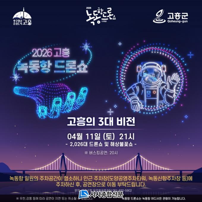ÇÑÆí, 2026 °íÈï ³ìµ¿Ç× µå·Ð¼î´Â 4¿ù 11ÀÏ Ã¹ °ø¿¬À» ½ÃÀÛÀ¸·Î ¿À´Â 10¿ù±îÁö ¸ÅÁÖ Åä¿äÀÏ Àú³á, ³ìµ¿Ç× ÀÏ¿ø¿¡¼ 900´ëÀÇ µå·ÐÀ» Ȱ¿ëÇÑ »ó¼³°ø¿¬ÀÌ ÁøÇàµÈ´Ù. ¶ÇÇÑ ¸Å¿ù ¸¶Áö¸· ÁÖ ±Ý¿äÀÏ¿¡´Â °íÈﱺû ¾Õ ±º¹Î±¤Àå¿¡¼µµ µå·Ð¼î°¡ °³ÃÖµÉ ¿¹Á¤ÀÌ´Ù.