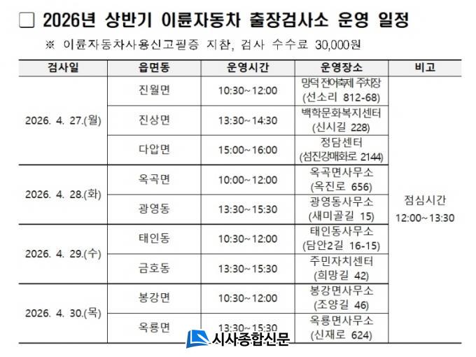 À̹ø ÃâÀå°Ë»ç ´ë»óÀº °Ë»ç À¯È¿±â°£ ¸¸·áÀÏÀÌ 2026³â 3¿ù 27ÀϺÎÅÍ 5¿ù 31ÀÏ »çÀÌÀÎ 50§¦ ÀÌ»ó 260§¦ ÀÌÇÏ Áß¡¤¼ÒÇü ÀÌ·ûÀÚµ¿Â÷´Ù. °Ë»ç¸¦ ¹ÞÀ¸·Á´Â ¼ÒÀ¯ÀÚ´Â ÀÌ·ûÀÚµ¿Â÷»ç¿ë½Å°íÇÊÁõ°ú °Ë»ç ¼ö¼ö·á µîÀ» ÁغñÇØ ÁöÁ¤µÈ Àå¼Ò¸¦ ¹æ¹®ÇÏ¸é µÈ´Ù.