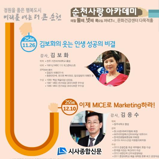 12¿ù ¼øÃµ»ç¶û¾ÆÄ«µ¥¹Ì¿¡¼´Â ±èÀÀ¼ö Çѱ¹MICEÇùȸ ȸÀåÀÇ ¡°ÀÌÁ¦ MICE·Î MarketingÇ϶󡱰Àǰ¡ ¸¶·ÃµÇ¾î ÀÖ´Ù. ±âŸ ¼øÃµ»ç¶û ¾ÆÄ«µ¥¹Ì¿¡ ´ëÇÑ ÀÚ¼¼ÇÑ ³»¿ëÀº ¼øÃµ½Ã¹®È°Ç°¼¾ÅÍ È¨ÆäÀÌÁö(http://www.schc.go.kr/) ¶Ç´Â Æò»ýÇнÀ°ú 749-6670~3À¸·Î ¹®ÀÇÇÏ¸é »ó¼¼ÇÑ ¾È³»¸¦ ¹ÞÀ» ¼ö ÀÖ´Ù.