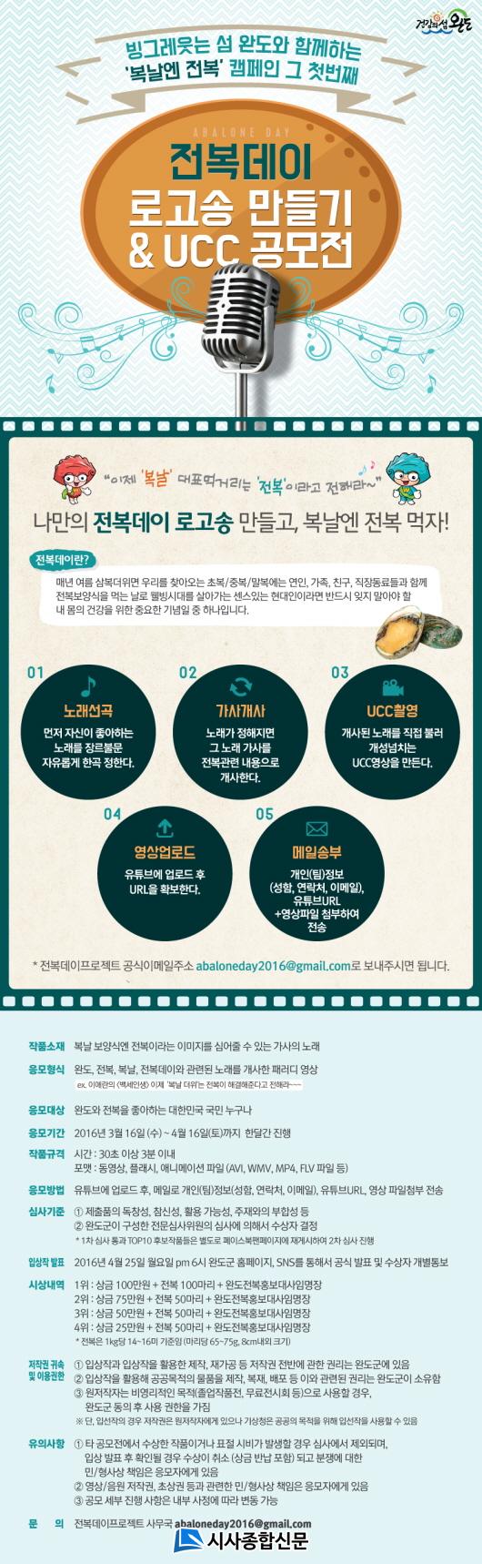 abaloneday2016@gmail.com)·Î Á¢¼öÇÏ¸é µÇ¸ç, ½Ã»óÀº 1À§(100¸¸¿ø, Àüº¹ 100¸¶¸®), 2À§(75¸¸¿ø, Àüº¹ 50¸¶¸®), 3À§(50¸¸¿ø, Àüº¹ 50¸¶¸®), 4À§(25¸¸¿ø, Àüº¹ 50¸¶¸®), ÃÑ 4°³ÀÇ ¼ö»óÀÛÀÌ ¼±Á¤µÇ¸ç ¼ö»óÀÚ´Â ¿Ïµµ±º Àüº¹È«º¸´ë»ç·Î À§Ã˵Ǹç, ±âŸ ÀÚ¼¼ÇÑ ³»¿ëÀº ¿Ïµµ±º °ø½Äºí·Î±×(