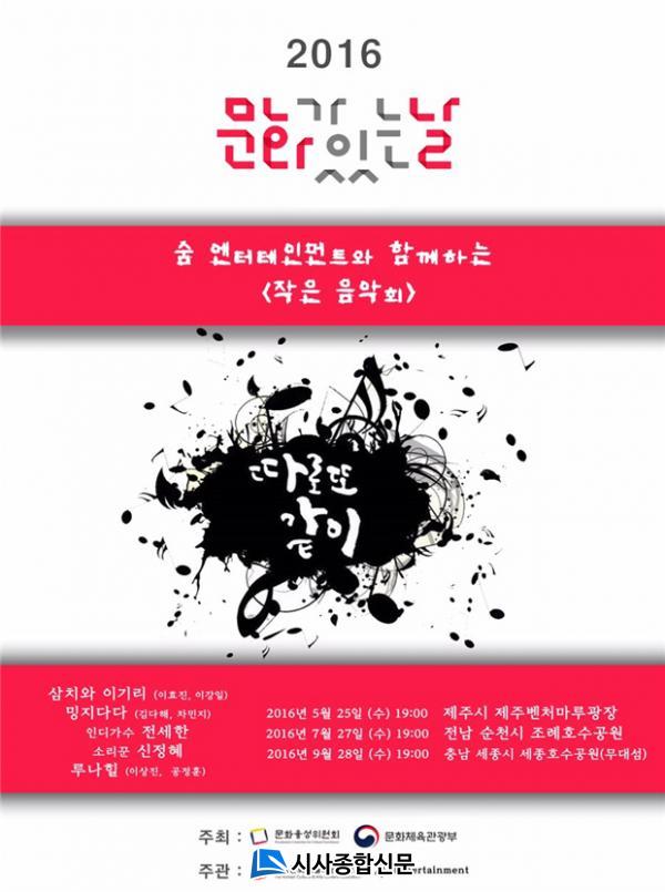 5¿ù 25ÀÏ¿¡´Â ¿ÀÈÄ 7½ÃºÎÅÍ 8½Ã 40ºÐ±îÁö Á¦ÁÖº¥Ã³¸¶·ç±¤Àå¿¡¼ °³ÃֵǴ ¼û ¿£ÅÍÅ×ÀÎ¸ÕÆ®¿Í ÇÔ²²ÇÏ´Â ÀÛÀº À½¾Çȸµû·Î ¶Ç °°ÀÌ´Â ¹®ÈÀ¶¼ºÀ§¿øÈ¸¿Í ¹®ÈüÀ°°ü±¤ºÎ¿¡¼ ¹®È°¡ ÀÖ´Â ³¯ °¢ ÁöÀÚüº° °ü°ø¼ ¹× À¯ÈÞ°ø°£À» ã¾Æ°¡´Â ÀÛÀº À½¾Çȸ °³ÃÖ»ç¾÷¿¡ ¼±Á¤µÈ À½¾ÇȸÀÌ´Ù.