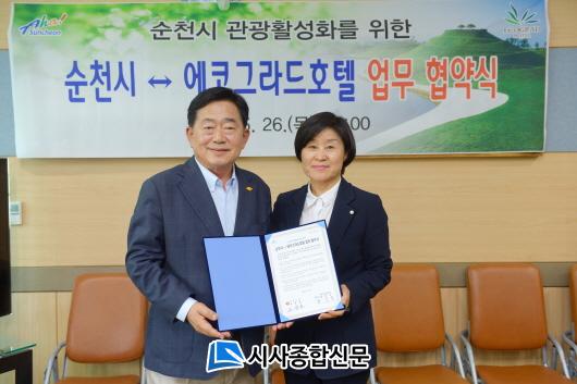[¼øÃµ/½Ã»çÁ¾ÇսŹ®]³²Àç¿Á ±âÀÚ = ¼øÃµ½Ã´Â 26ÀÏ ½ÃÀå½Ç¿¡¼ ¿¡ÄÚ±×¶óµåÈ£ÅÚ È¸Àå(Çѳ²¼÷)µî ÀÌ Âü¼®ÇÑ °¡¿îµ¥ ¼øÃµ½Ã °ü±¤È°¼ºÈ¸¦ À§ÇÑ ¼øÃµ½Ã&¿¡ÄÚ±×¶óµåÈ£ÅÚ ¾÷¹«Çù¾àÀ» ü°áÇß´Ù
