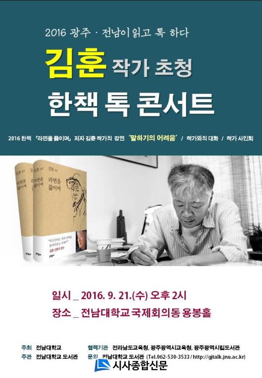À̳¯ Åå ÄܼƮ´Â ¿ÃÇØÀÇ ÇÑÃ¥À¸·Î ¼±Á¤µÈ '¶ó¸éÀ» ²úÀ̸硯ÀÇ ÀúÀÚ ±èÈÆ ÀÛ°¡¸¦ ÃÊûÇÑ °¡¿îµ¥ ¡®¸»ÇϱâÀÇ ¾î·Á¿ò¡¯À» ÁÖÁ¦·Î °¿¬È¸¸¦ °¡Áø µ¥ À̾î ÀÛ°¡¿ÍÀÇ ´ëÈ, »çÀÎȸ ¼øÀ¸·Î ÁøÇàµÈ´Ù. Àü³²´ëÇб³´Â Áö³ 2013³âºÎÅÍ ±¤ÁÖ¡¤Àü³² ½Ãµµ¹Î°ú ÇÔ²²ÇÏ´Â µ¶¼¿îµ¿À¸·Î ¡®±¤ÁÖ¡¤Àü³²ÀÌ Àаí Åå ÇÏ´Ù¡¯¸¦ ÁøÇàÇϰí ÀÖÀ¸¸ç, ½Ãµµ¹ÎÀÇ Á÷Á¢ ÅõÇ¥·Î ÇÑ ±ÇÀÇ Ã¥À» ¼±Á¤ÇØ ÇÔ²² Àаí Åä·ÐÇϸç À̾߱⸦ °øÀ¯ÇÏ´Â ÇÁ·Î±×·¥ÀÌ´Ù. ¿ÃÇØ´Â Áö³ 4¿ù 18ÀϺÎÅÍ 5¿ù 17ÀϱîÁö ÃÑ 30,528¸íÀÌ ÅõÇ¥¿¡ Âü¿©, ±èÈÆ ÀÛ°¡ÀÇ '¶ó¸éÀ» ²úÀ̸硯¸¦ '2016 ÇÑÃ¥¡®À¸·Î ¼±Á¤ÇÑ ¹Ù ÀÖ´Ù.