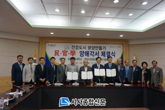 [±¤¾ç/½Ã»çÁ¾ÇսŹ®]Àå¹Î±Ô ±âÀÚ = ±¤¾çº¸°Ç´ëÇб³(ÃÑÀå À̼º¿õ)°¡ Áö¿ª»çȸ¿Í ÇÔ²²Çϱâ À§ÇØ ¹ÚÂ÷¸¦ °¡Çϰí ÀÖ´Ù. ±¤¾ç½Ã°¡ Á¦¾ÈÇÑ °Ç°µµ½Ã ±¤¾ç¸¸µé±âÀÇ ¼º°øÀûÀÎ ÃßÁøÀ» À§ÇØ 10¿ù 6ÀÏ ±¤¾ç»ç¶ûº´¿ø, ±¤¾ç¼¿ïº´¿ø°ú ÇÔ²² ¾çÇØ°¢¼¸¦ ü°áÇÏ°í °Ç°µµ½Ã Á¶¼º¿¡ ÈûÀ» ÇÕÄ¡±â·Î °áÀÇÇß´Ù.