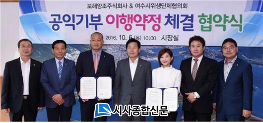 ¿©¼ö½Ã(½ÃÀå ÁÖöÇö)´Â ±â¾÷°ú »çȸ´Üü°¡ Áö¿ª¹ßÀüÀ» À§ÇÑ Çù·Âü°è¸¦ ±¸ÃàÇϴµ¥ Å« Àǹ̸¦ µÎ°í º¸ÇؾçÁ¶ÀÇ °øÀͱâºÎ¸¦ ¿©¼ö½ÃÀ§»ý´ÜüÇùÀÇȸ¿Í ¿¬°èÇØ ÃßÁøÅä·Ï ÇÑ °¡¿îµ¥, À̹ø °øÀͱâºÎ ÀÌÇà¾àÁ¤À¸·Î º¸ÇؾçÁ¶(ÁÖ)´Â ¿©¼öÁö¿ª¿¡¼ ÆÇ¸ÅµÇ´Â ÀÙ»õÁÖ 1º´´ç 2¿ø¾¿À» ±âºÎÇϰí, ¿©¼ö½ÃÀ§»ý´ÜüÇùÀÇȸ´Â ±âºÎ±ÝÀ» À½½ÄÁ¢°´¹®È °³¼±»ç¾÷¿¡ Ȱ¿ëÇÏ°Ô µÈ´Ù.