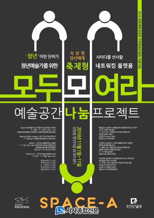 Àü³²´ëÇб³ ¹®ÈÀü¹®´ëÇпø ¿¬±¸Áø(Ã¥ÀÓ ±èÀμ³ ±³¼ö)°ú ±¤ÁÖ±¤¿ª½Ã ³²±¸Ã»Àº ¡®¿¹¼ú°ø°£³ª´® ÇÁ·ÎÁ§Æ®, Space A¡¯(ÀÌÇÏ Space A)¸¦ 11¿ù 1ÀϺÎÅÍ 11ÀϱîÁö 10ÀÏ °£ ¾ç¸²µ¿ Æë±Ï¸¶À» ÀÏ´ë¿¡¼ ÁøÇàÇÑ´Ù. Áö¿ª û³â¿¹¼ú°¡ ¹ß±¼¿¡¼ºÎÅÍ ½ÃÀåÀü·«¿¡ À̸£±â±îÁö ÃÑüÀûÀÎ Á¤Ã¥°³¹ß ¾ÆÀ̵ð¾î¸¦ ±âȹÇϰí À̸¦ Àû¿ëÇØº¸´Â ÇÁ·Î±×·¥ÀÌ´Ù.