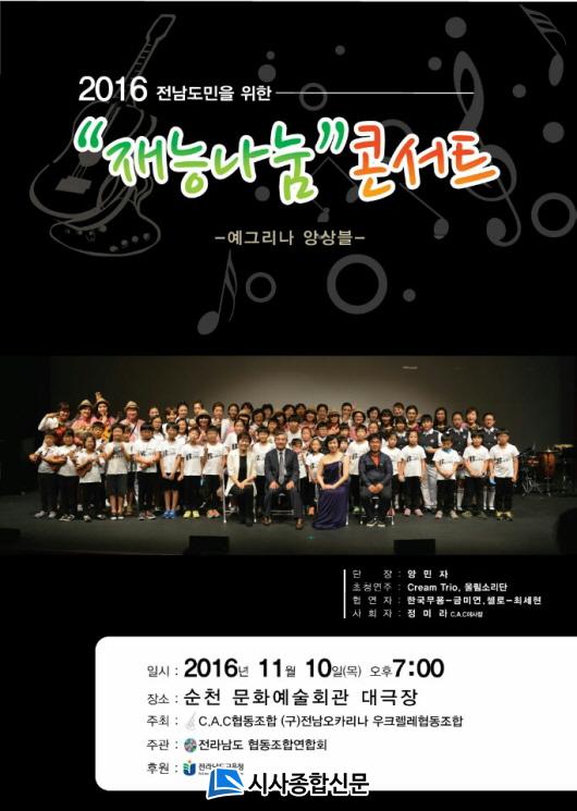 10ÀÏ ¿ÀÈÄ 7½Ã ¼øÃµ¹®È¿¹¼úȸ°ü ´ë±ØÀå¿¡¼´Â Àü³²µµ¹ÎÀ» À§ÇÑ ¡®Àç´É ³ª´® ÄܼƮ¡¯°¡ ¿¸°´Ù. Àç´É ³ª´® ÄܼƮ¡¯´Â Àü¶ó³²µµÇùµ¿Á¶ÇÕ¿¬ÇÕȸ(ȸÀå ±èÈÁø)°¡ ÁÖ°üÇϰí Àü¶ó³²µµÇùµ¿Á¶ÇÕ¿¬ÇÕȸ ȸ¿øÀÎ C.A.C Çùµ¿Á¶ÇÕ(±¸ ¿ÀÄ«¸®³ª¿ìÅ©·¼·¹)ÀÌ ÁÖÃÖÇØ ¿¸°´Ù.