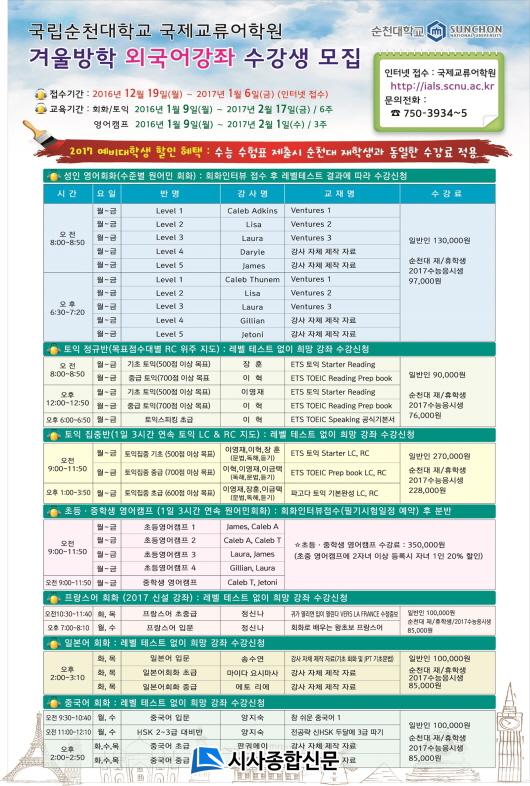 ¼øÃµ´ë ±¹Á¦±³·ù¾îÇпø(¿øÀå Á¶°èÁß)Àº ¸Å³â Çϰè․µ¿°è ¹æÇÐ Áß¿¡ ¿µ¾îȸÈ, ÅäÀÍ, ÃÊ․Áßµî ¿µ¾îÄ·ÇÁ, Á¦2¿Ü±¹¾î µî ´Ù¾çÇÑ ¾îÇÐ °Á ÇÁ·Î±×·¥À» ¿î¿µÇϰí ÀÖ´Ù. ÀçÇлý, ±³Á÷¿ø µî ´ëÇÐ ±¸¼º¿øÀº ¹°·Ð ÃÊ․Áß․°íµîÇлýÀ» Æ÷ÇÔÇÑ ÀϹÝÀÎÀ» ´ë»óÀ¸·Î ÇÑ´Ù.