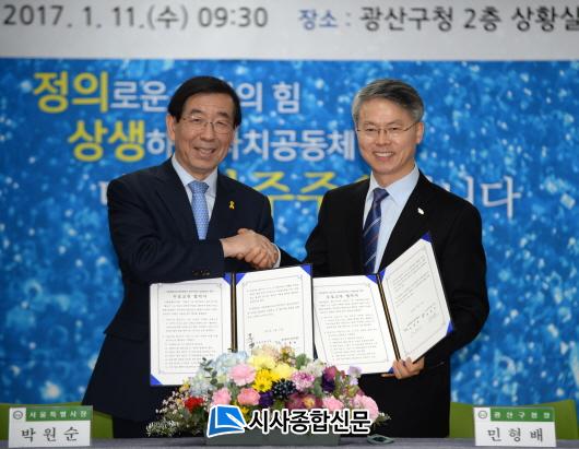 ±¤»ê±¸¿Í ¼¿ï½Ã´Â À̳¯ ¿ÀÀü 9½Ã 30ºÐ ±¤»ê±¸Ã» »óȲ½Ç¿¡¼ ¹Ú¿ø¼ø ¼¿ï½ÃÀå°ú ¹ÎÇü¹è ±¤»ê±¸Ã»ÀåÀÌ Âü¼®ÇØ ¡®¿ì¼ö Á¤Ã¥»ç·Ê Çù¾à¡¯À» ü°áÇß´Ù. Çù¾àÀº ¼¿ï½ÃÀÇ Á¦¾ÈÀ¸·Î ÀÌ·ïÁ³´Ù. ±¤»ê±¸¿Í ¼¿ï½Ã´Â 6°³ ºÐ¾ß Á¤Ã¥ °øÁ¶ Çù¾àÀ» ¸Î¾ú´Ù. ¡â½ÃÁ¤Çõ½Å ¹× ¿ì¼ö Á¤Ã¥»ç·Ê Á¤º¸ °øÀ¯ ¡â»çȸÀû°æÁ¦ Çù·Â ¡â¸¶À»°øµ¿Ã¼ ³×Æ®¿öÅ© ±¸Ãà¡â¹®È¿¹¼ú ±³·ù È®´ë ¡âû³â ÀÚ¸³ »ýŰè Á¶¼º Çù·Â ¡â»ç¶÷ Áß½ÉÀÇ µµ½ÃÀç»ý ¹× µµ½ÃµðÀÚÀÎ Á¤Ã¥ °øÀ¯°¡ Çù¾àÀÇ ´ë»óÀÌ´Ù.